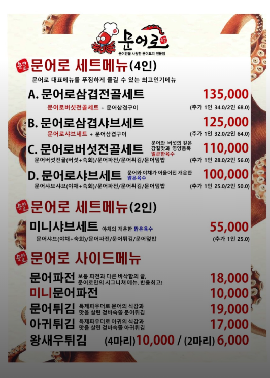 문어로 메뉴와 가격입니다
